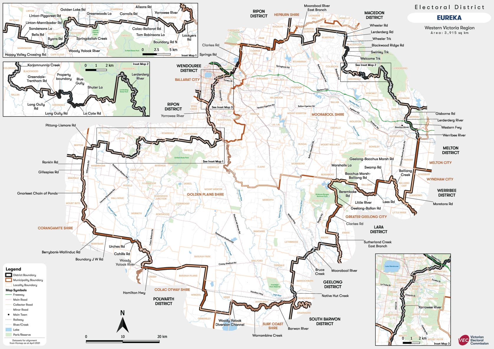 The Eureka electorate is made up of Bacchus Marsh, Ballan, Brown Hill, Bungaree, Buninyong, Canadian, Clarendon, Darley, Elaine, Eureka, Gordon, Inverleigh, Lethbridge, Maddingley, Meredith, Mount Clear, Mount Egerton, Mount Pleasant, Rokewood, Shelford, Teesdale, and Warrenheip. The electorate covers 3,915 square kilometres.